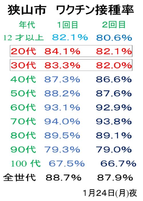 前回12月末の時点では、2回目の接種率で、20代78.7%、30代79.7%だったので、だいぶ上がりました。