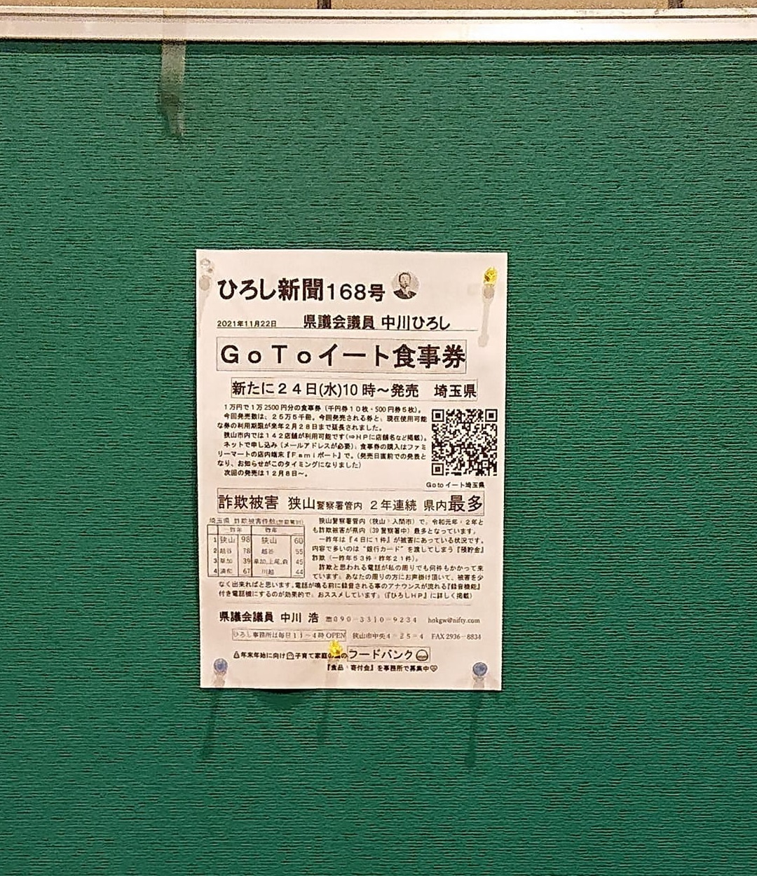📷️『賃貸マンション』に、私の新聞を掲示して下さっている事を一昨日知りました。これまで自治会役員さんから「自治会の掲示板に貼った」と連絡を頂いたりしましたが、私は『賃貸』も重視していたので、ありがたいです m(__)m。賃貸にお住まいの方は、比較的 地域の人との接点が少なかったり、”選挙で投票に行くなんて考えられない”方が少なくないと意識して来ました。投票に行って頂きたい事よりも まず、皆さんの代理で働かせて頂いているので、皆さんにとって重要な事や生活に直結する事を伝えなければとこれまで169回(最初の頃は1回3千部)配って来ました(昨日も配布)。その思いは以前より今が1番強いです。まず自分が最大限動かねばと。