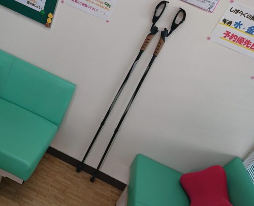 接骨院のこんな目を引く・座っていて手が届く待合スペースに置いて頂いたスティック。触れます。