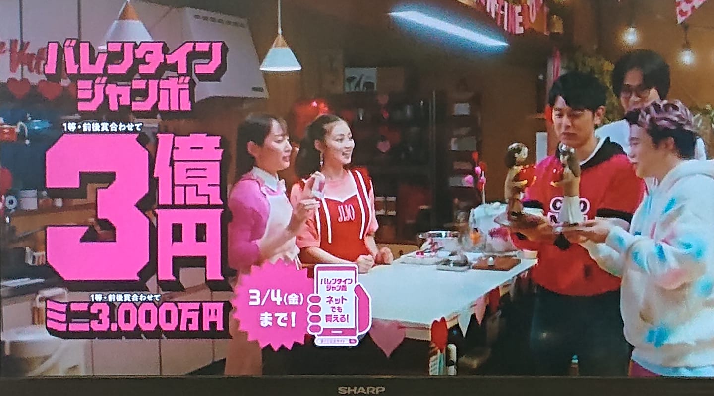 1枚300円で、抽選日が3月11日(金)なので、当たれば14日(月)のホワイトデーにお返しが間に合います(6等3千円、7等300円。”上”を見過ぎないで (^O^))。