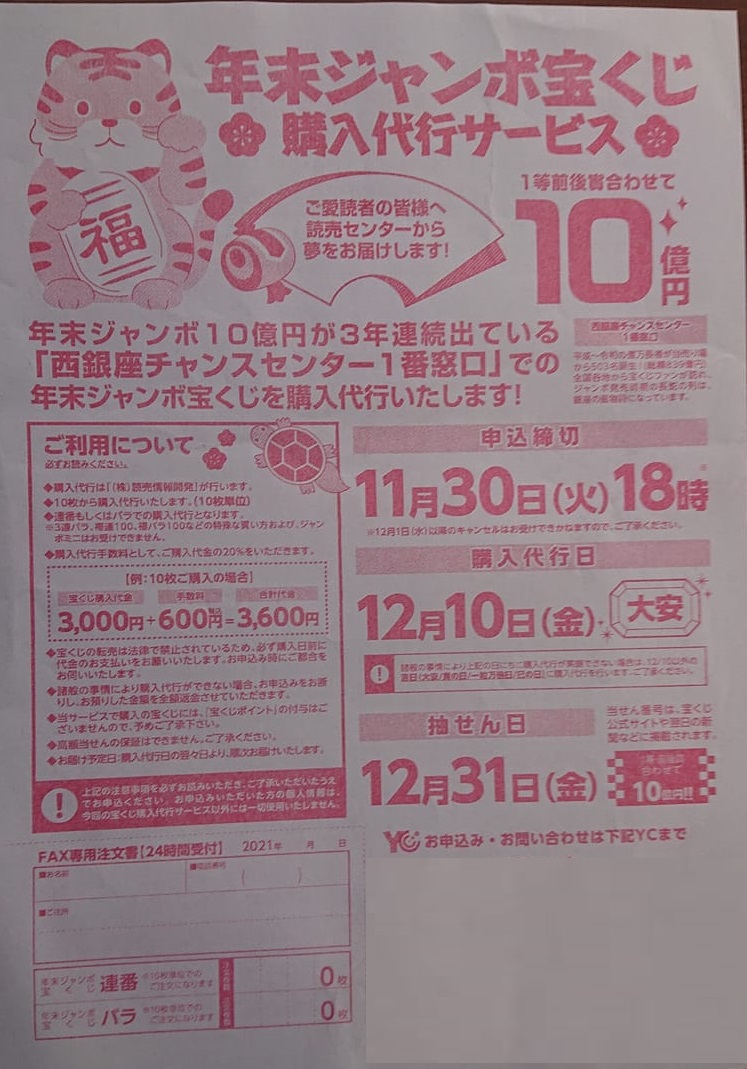 銀座での宝くじ購入を代行する読売の折り込み広告、昨年末だけで2回も入っていました。県の税収と、読売新聞の競争です。