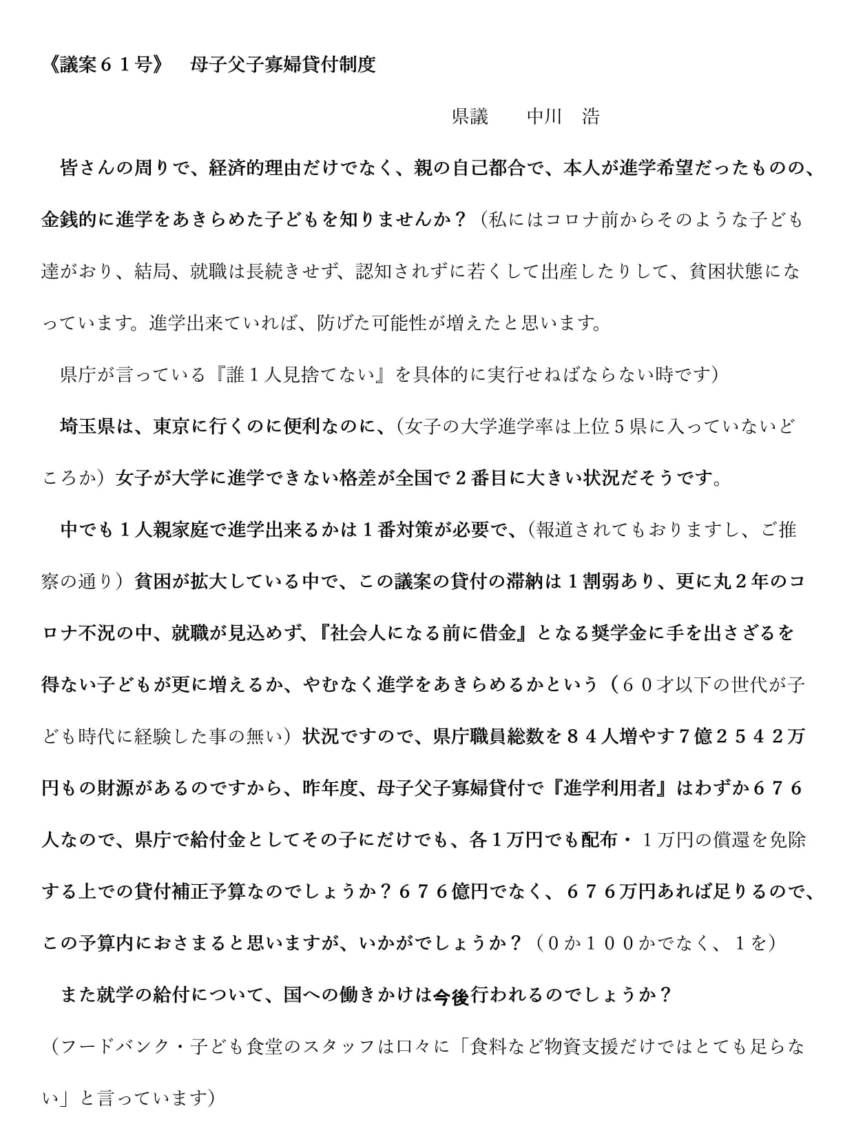 1人親家庭で進学出来るかは1番対策が必要で、(報道もされているように)貧困が拡大している中で、今日審議する議案の『貸付』の滞納は1割弱あり、更に丸2年のコロナ不況の中、就職が見込めず、『社会人になる前に借金』となる奨学金に手を出さざるを得ない子どもが更に増えるか?