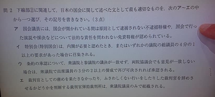 今日の県立高校入試問題⇩。【国会議員の『特権』】が問題になっています。あ、間違えました。特権についてが試験問題になっています。これを子ども達はどう思うのでしょう?安倍晋三衆議院議員など 国政は改善して、入試問題を変える必要があります。(回答は、明日の埼玉新聞でご確認下さい)