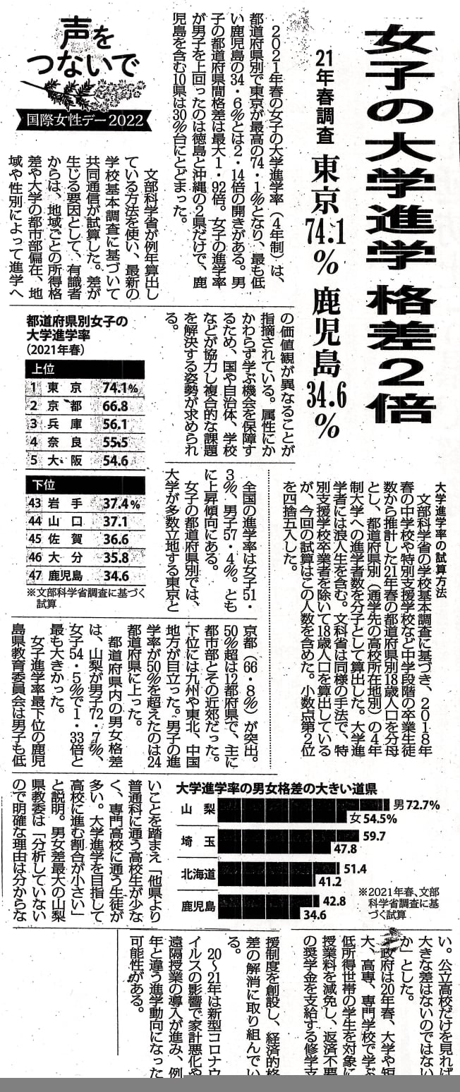 なぜ埼玉県は、東京に行くのに便利なのに(女子の大学進学率は上位5県に入っていないどころか、女子が大学に『進学できない』格差が全国で2番目なのか。