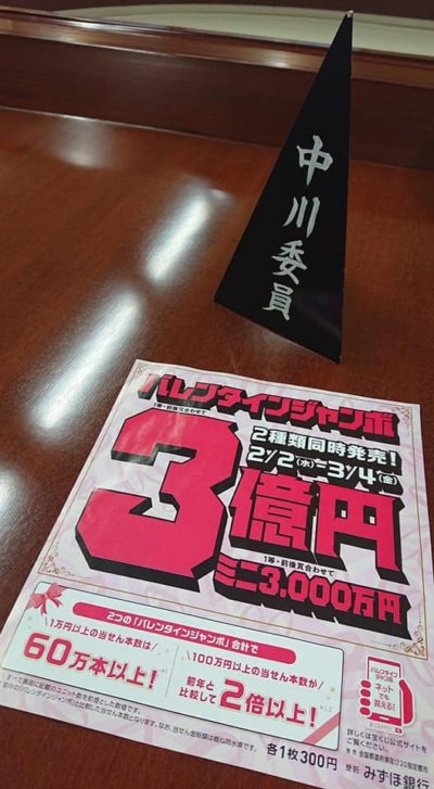 議会の休憩中に、部長・課長・県議と、宝くじの収益の3割が、県の税収になるので、現在発売中のバレンタインジャンボなど『ジャンボ宝くじ』を、どうPRしていくか話しました。 (企画財政委員会)