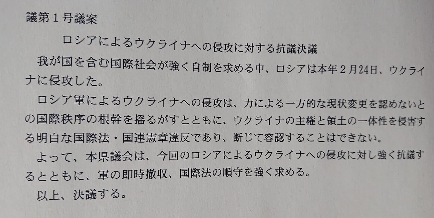 【埼玉県議会】全員一致で、ウクライナの為に出来る事