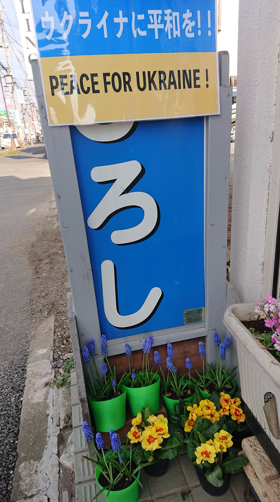 まる2年におよぶコロナ禍で、お花屋さんも大変。黄色・青のお花を買い、早速 事務所前に飾りました。青い花束ならこの時期『デルフィニウム』との事。『ウクライナと、ロシア国内で反戦活動をされている方』に、想いをはせて下さる回数が増えるように。