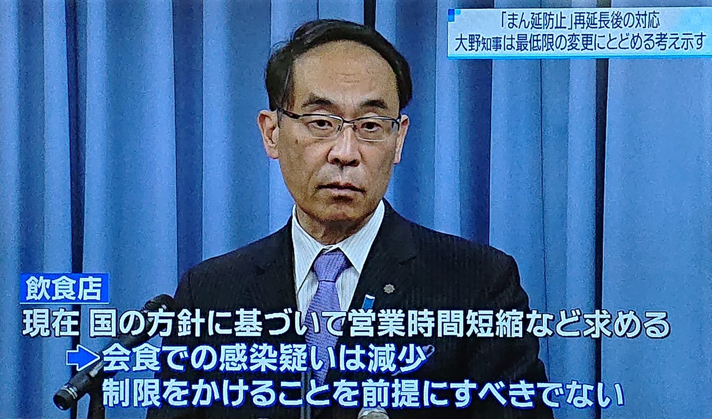 きょう私から まず担当部長に「知事が昨日『延長期間は1都3県で意見が分かれた為、国に判断を任せる事にした』と言ったのは どう分かれたのか?」聞いた上で、知事に「(事業者は直接影響を受けるので)具体的に話して」と言ったからかどうかは分かりませんが、今夜(木)⇩このように報道されて良かったです。今日も飲食店の役員さんなどから何件も問い合わせを頂いています。