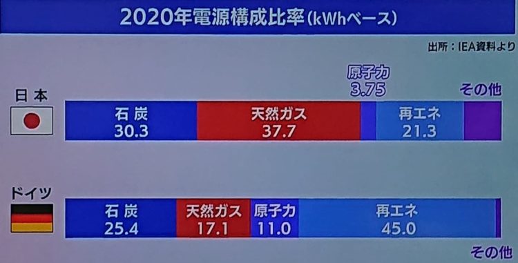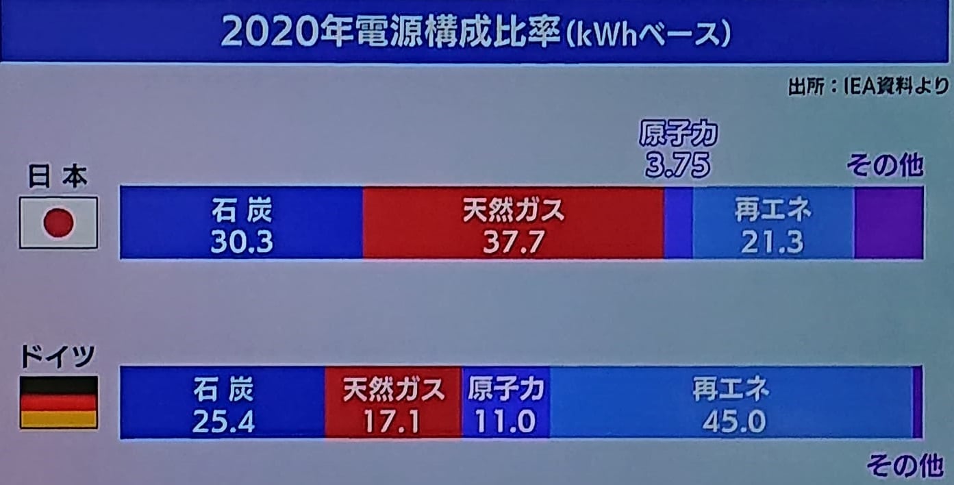 ドイツの自然エネルギーの日本は半分以下。資源無いのに。