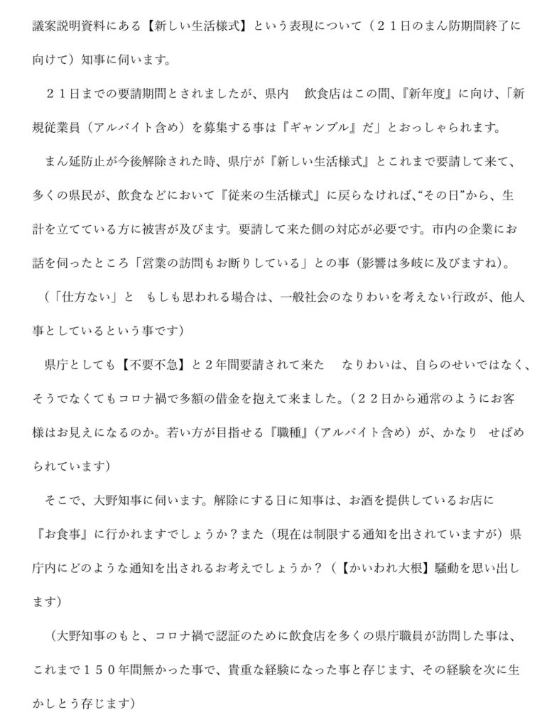 解除後に向けて、県民・(県庁)職員にどう促していくのか?飲食店を利用して頂けるのか」と2度質問があり、県庁からは「職員に向け1月7・19日に出した通知は、飲食ダメとはしておらず、職場全員で行うのはダメ。2時間以内に利用するようにとなっている。
