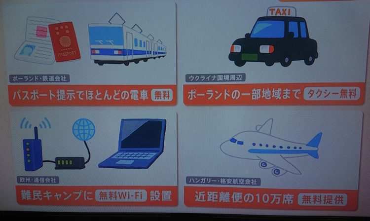 募金活動をしていて、戦中・戦後の経験をお話下さる方が「空襲時、畑のうねりに皆隠れたが、私だけ かがまなくて、怒られた事をウクライナで思い出した」「車のタイヤを切って、鼻緒を付けて草履にしたが、とても冷たかった」「給食は、国際機関からニンジンジュースに牛乳を混ぜる とてもマズい物が提供され、今も国際機関に寄附金を贈っている」。