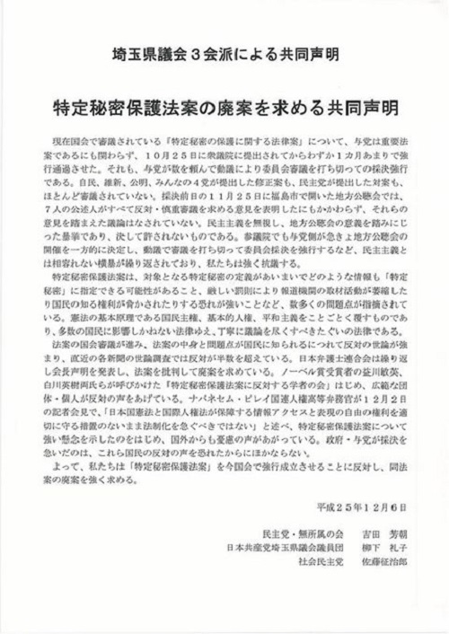 埼玉県議会3政党での、秘密保護法案 廃案を求める共同声明文!