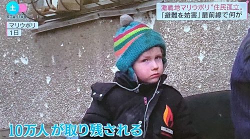 マリウポリには現在も少なくとも10万人が。ロシア軍のせいで避難できない。 (写真は今夜のTV朝日)
