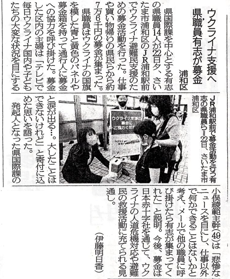 埼玉県庁職員の有志14人がJR浦和駅前で募金活動を23日(金)夕方行ったとの事。県庁職員が街頭募金を行った事自体(ウクライナ以外を含めて)初めて。行政が何かの啓発で駅前などでチラシを配ったりする事はありますが、このような『対話』型の機会を作る事が今後増えていけばと思い、活動を行った複数の職員から感想を聴きました。「通られる方の関心は高い。学生さんを含め幅広い年齢層が『出来る範囲で』と協力して下さった」と話していました。このような県庁職員の取り組みは、住民として『安心感』が増します。そして、うれしい😊。