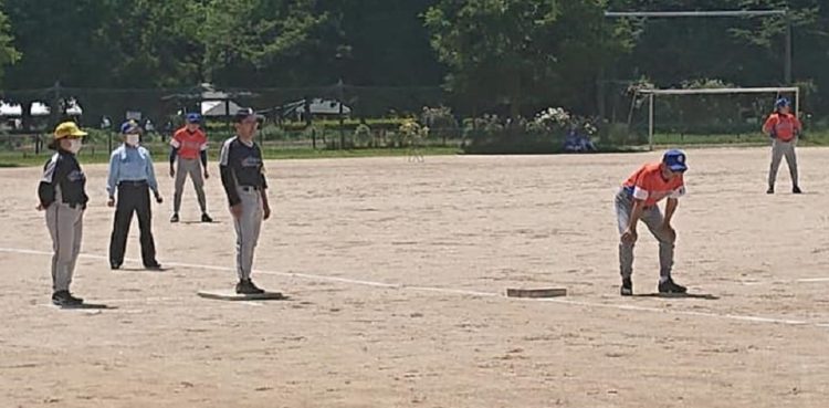 守備用と走塁用のベースは安全上別になっており、走塁用ベースは大きく、1・3塁はファール側にある(📷黒いユニフォームの男性のいる所が3塁走塁ベース)。