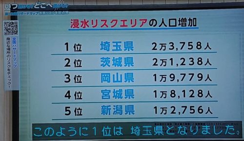 『浸水リスクエリア(※)』埼玉県は多いと、県内を普段回っていて感じていました。例えば気になるのは武蔵野線沿線です。(※市街化調整区域で家を建てる事を緩和したエリア)皆さんも思いあたる所があると思います。今後詳しく分析していきたいと思います。