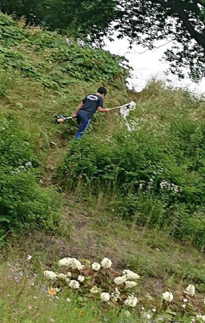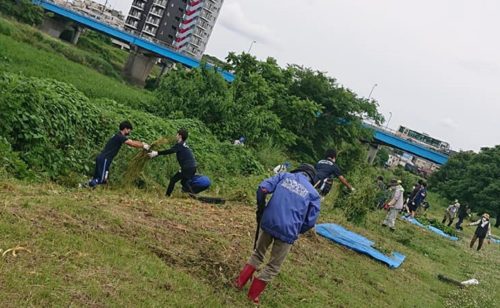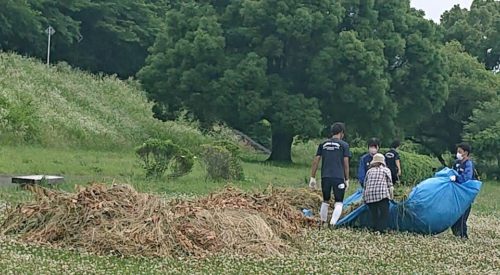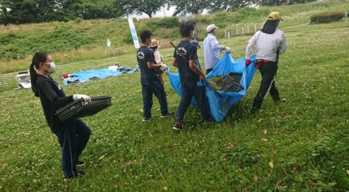 市職員さんが草刈り機で刈って、この後これをみんなで集め、