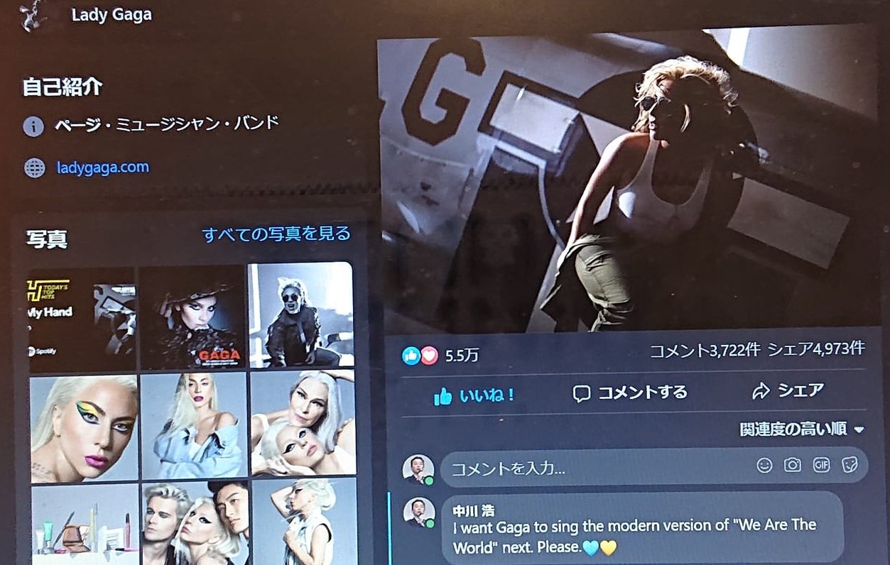 レディー・ガガさんのFacebookに「次は🎵『We Are The World』の現代版を歌って欲しいです。お願いします」とコメントさせて頂きました🇺🇦。The power of music.