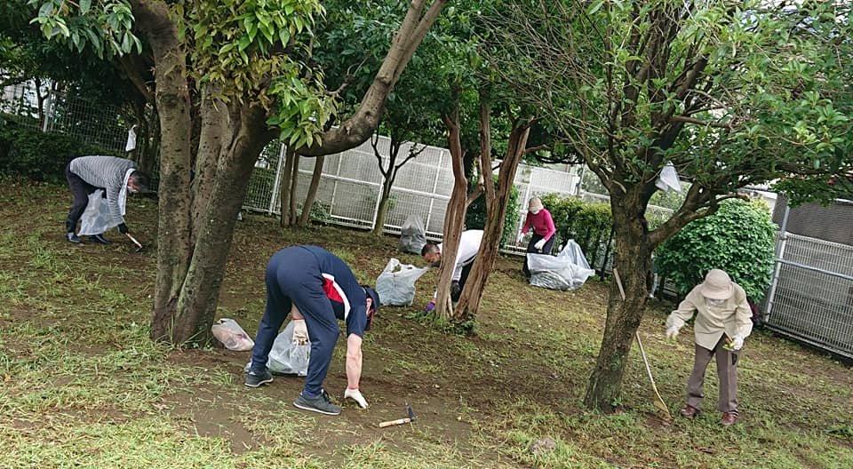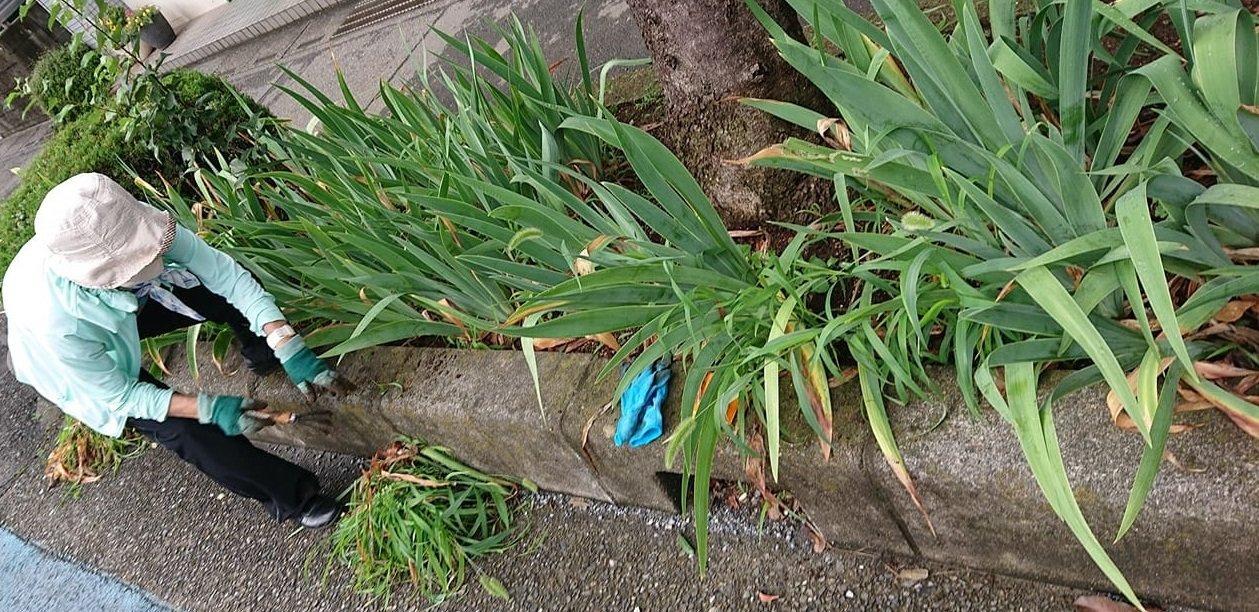 公園での草刈りが終わって、住んでいる集合住宅の前に戻ると、街路樹の草刈りをしている方がいたので、私も継続して参加。