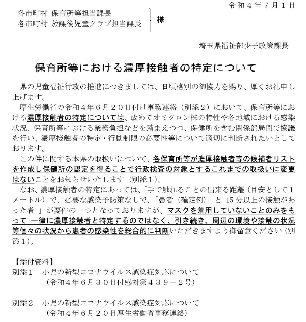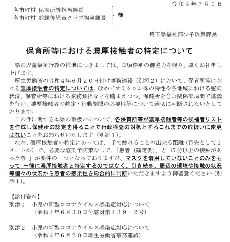 埼玉県の現在の通達文の3枚目には「保育所に一律に濃厚接触者の特定は求めていない」と書いてあり、県庁と打ち合せ。