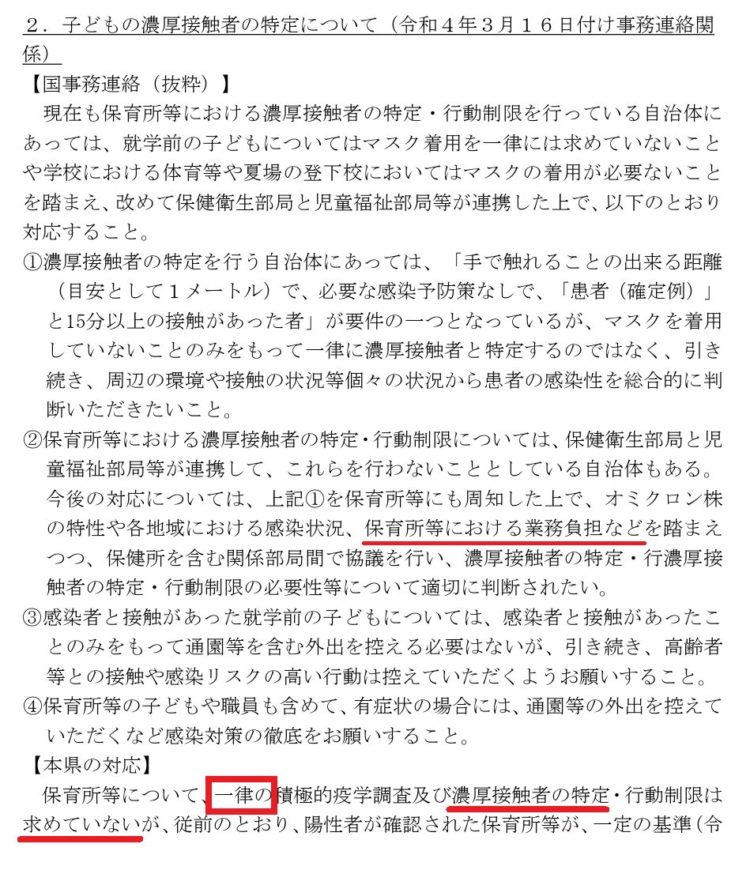 「濃厚接触者の候補者リストを作成するかは、保育所ごとの判断」という主旨の文書である事を県庁に確認すると共に、県庁は今後、再度通達文を出すとの事(文書が出る際、お伝えします)。市役所にもその事を伝えました。