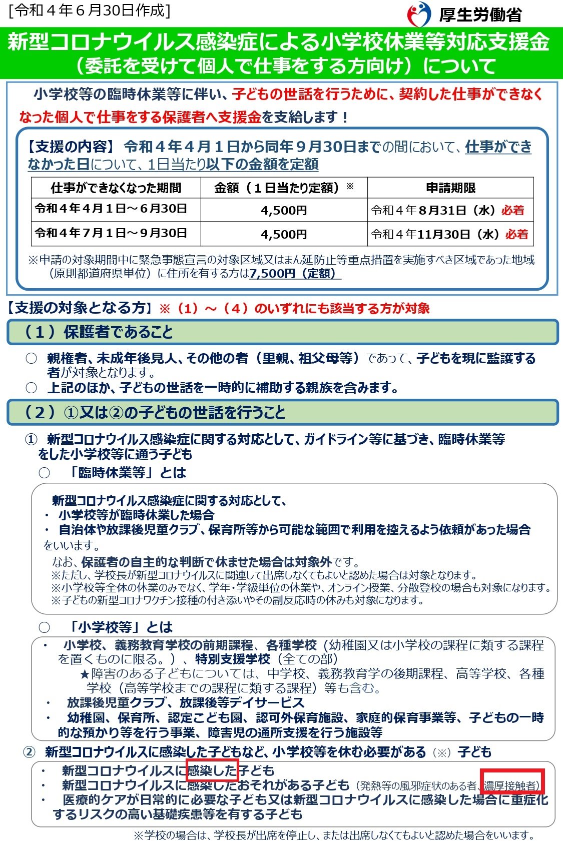 新型コロナウイルス感染症による小学校休業等対応支援金(委託を受けて個人で仕事をする方向け)ー厚生労働省