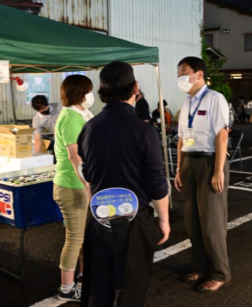 会場で私は消防署の方々とコロナ・熱中症対応について話し、警察署15人くらいに挨拶し、市民の方々にお話を伺いました。フードバンクへの寄付のお申し出も頂きました。