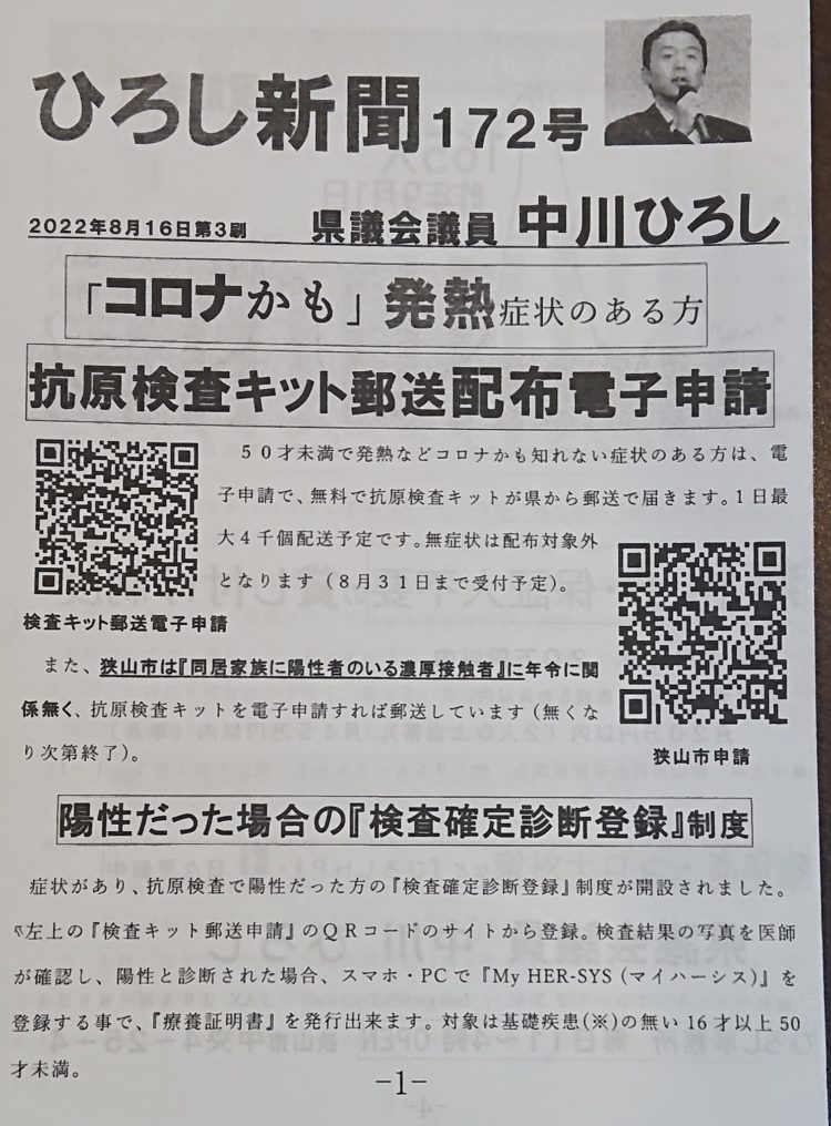 172号もあっと言う間に『第3刷』。情報を更新しています。第3刷では、①狭山市が行い始めた『同居家族に陽性者のいる濃厚接触者』に年令に関係無く、抗原検査キットを電子申請すれば郵送する事を加え、②生活困窮の方が増えているので、『無利子』の貸し付けを社会福祉協議会が行っている事を紹介しました。