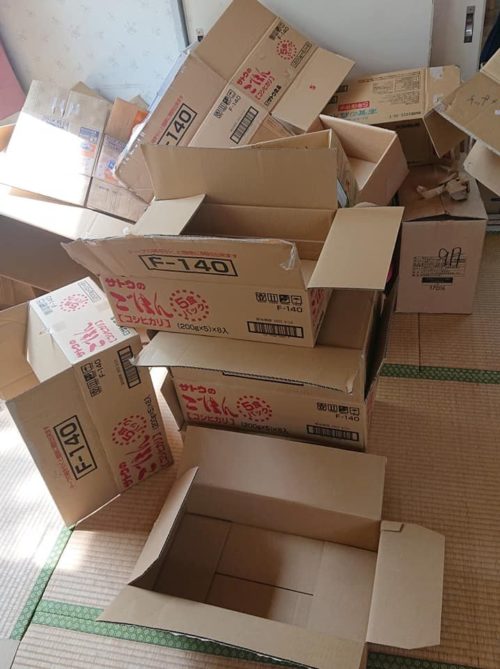 寄付して下さる方々のお陰で、今回も配布量が多く、出る段ボールが多い為、作業が終われば別の仕事に行くので、食品を家庭にお渡ししている最中に片付けをしないと効率が悪く、民間並みの作業スピード(スーツでは作業できません)で動いてます👍。