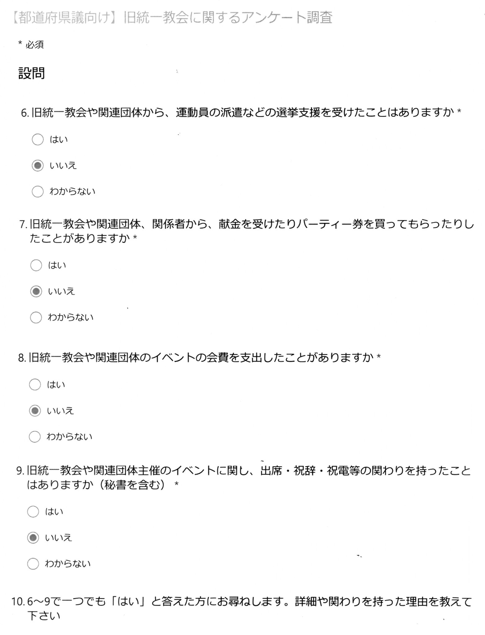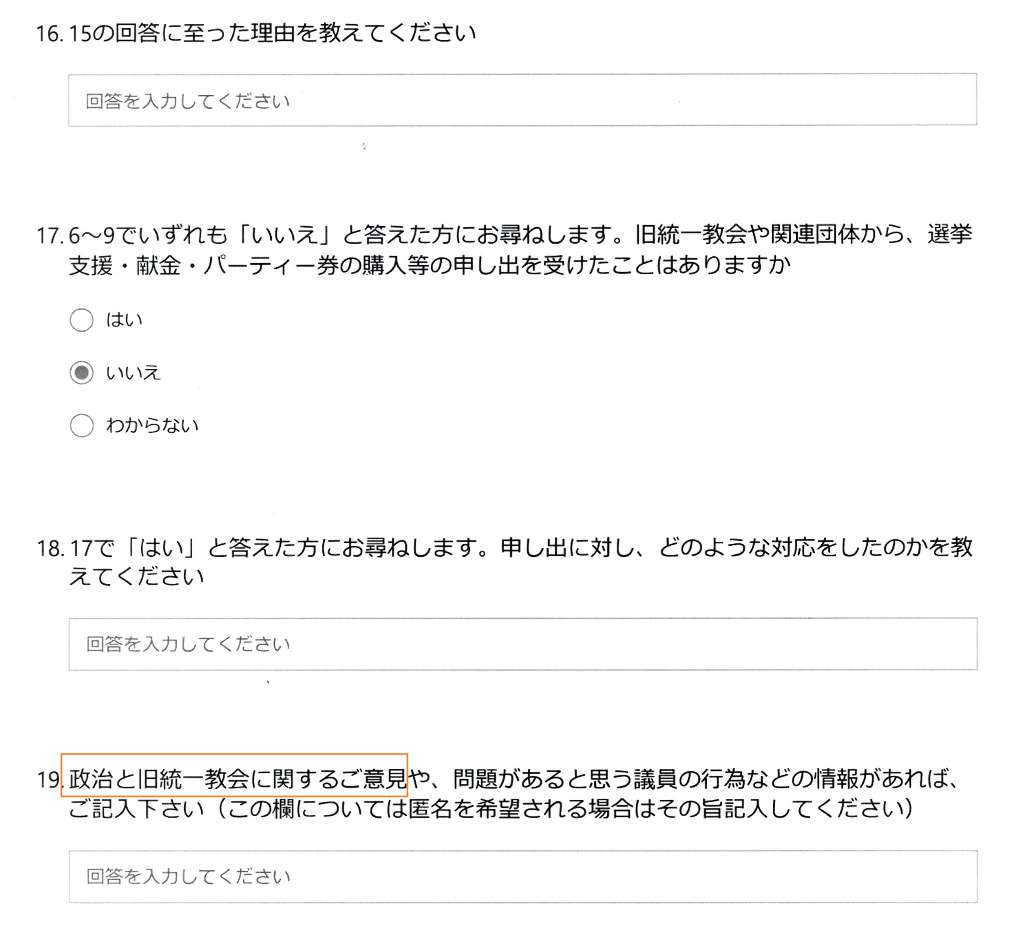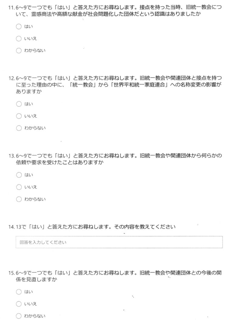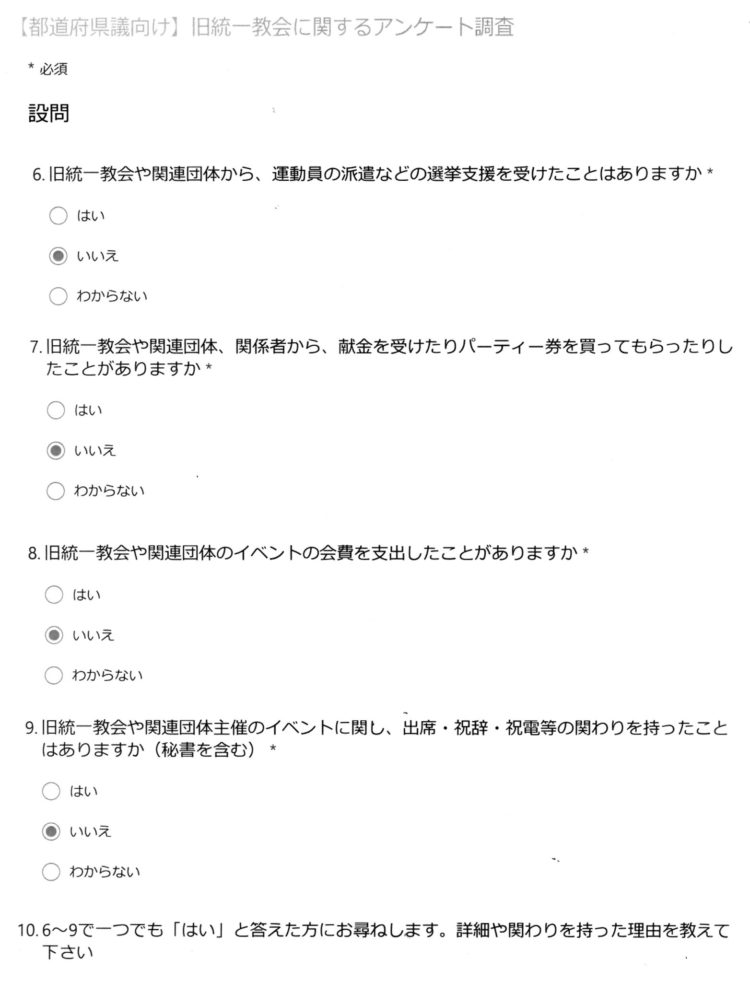 『統一教会』について新聞社から都道府県議会議員などにアンケートが来ました。さてアンケートの設問⑲『政治と旧統一教会に関するご意見』に何と書きましょうか?少なくとも現時点で書こうと考えている事は「山上容疑者の兄をはじめ、困窮して自殺された方は何人いるのでしょう?」「マスコミの責任も、とても大きいと思います。統一教会被害弁護団は、以前からこの問題を発信していました。今回を教訓に『困っている国民についての事は、世間が飽きても報道』して下さる事になるでしょうか?」「元アイドルの参議院議員は、今回の事件が無かったとしたら、新たな広告塔になっていた事でしょう。知名度メインの政治から抜け出さないとなりませんし、『寄らば大樹』の政治を変えないと、日本は悪くなる一方です」「『夫婦別姓・LGBTQ』の事が国政で前進する事を望みます」。