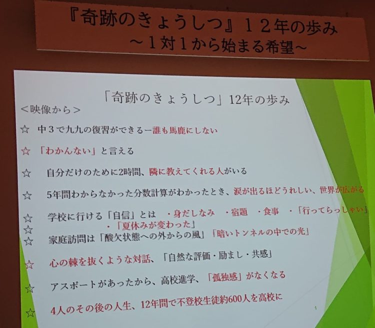 白鳥勲 前代表理事「子ども達の幸福度は今、うんと低い。12年間で支援がなかったら高校に行けなかったのは600人。『障害者枠で就職すれば勉強なんてさせなくていい』と言う大人もいたが。高校をトップで卒業した生徒も。