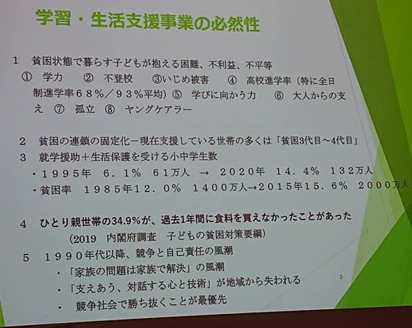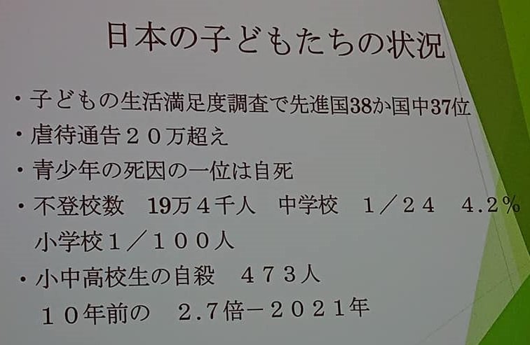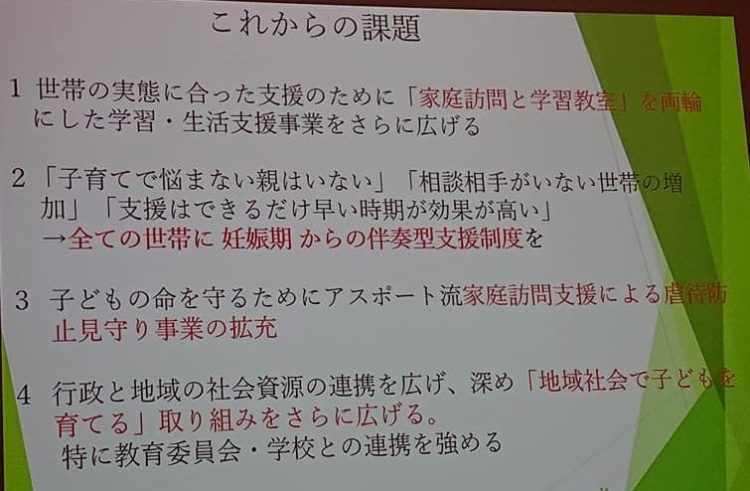 『家庭の問題は家庭で解決』という風潮を絶たないと。子ども達が「まんざら悪い世界ではない」と思えるようにならないと。家庭訪問により、様子が分かり、事件も防止出来る。スローガンを現実に。全ての世帯で妊娠期からの伴奏型支援を」。