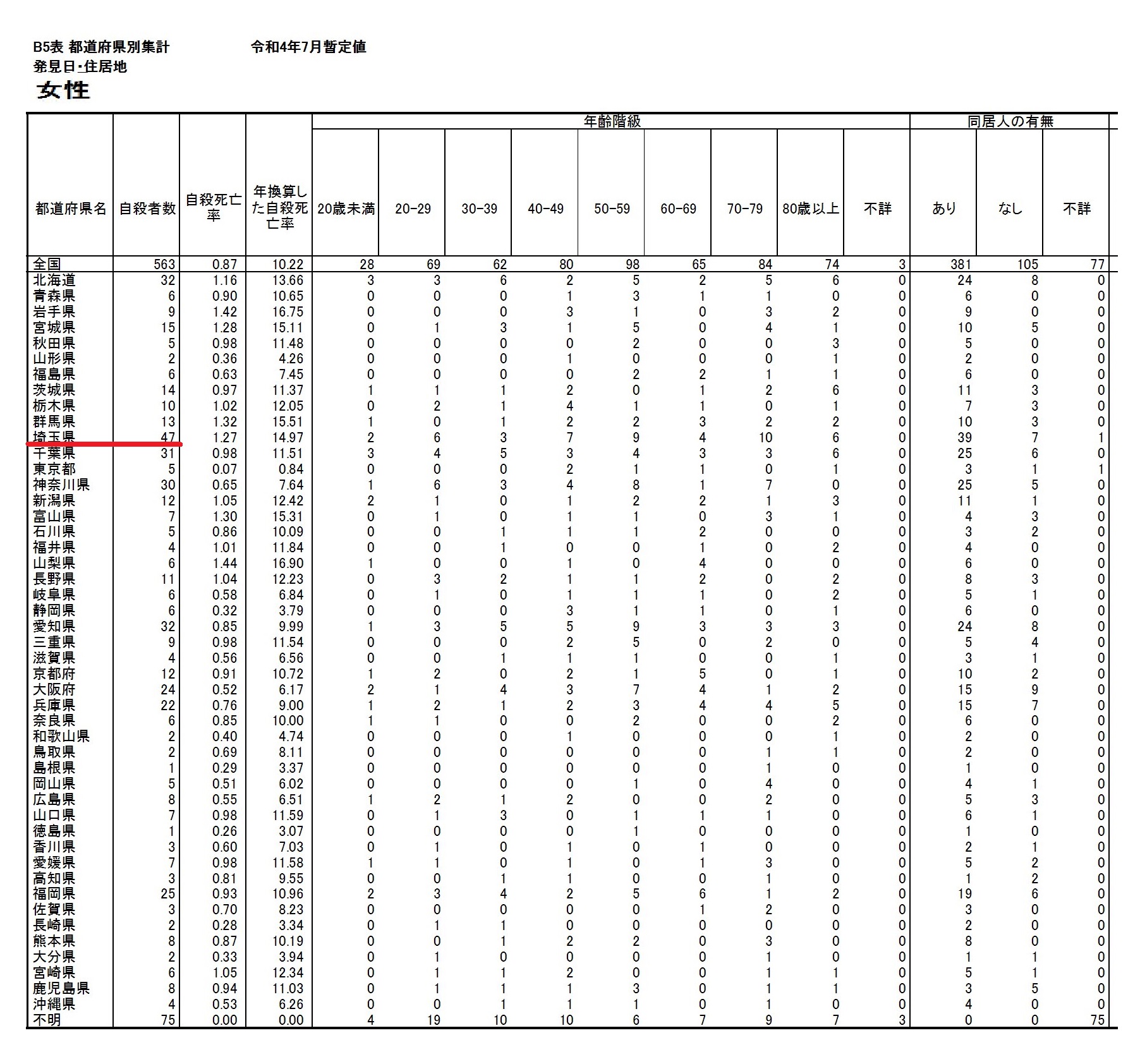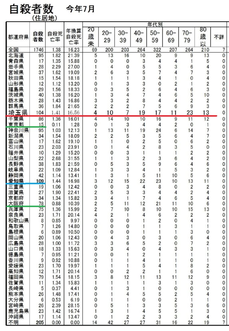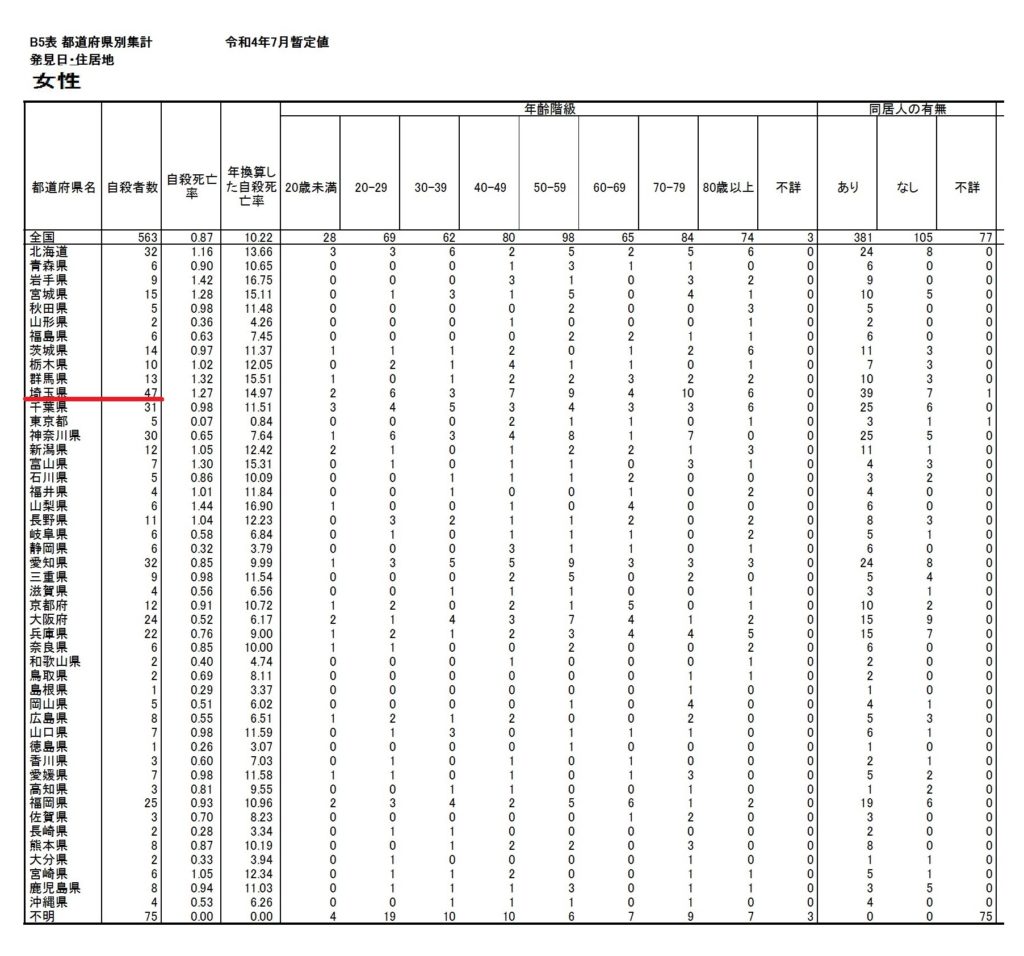 女性の自殺者(7月) 埼玉県は全国で1番多い事も分かりました。残念ながら。