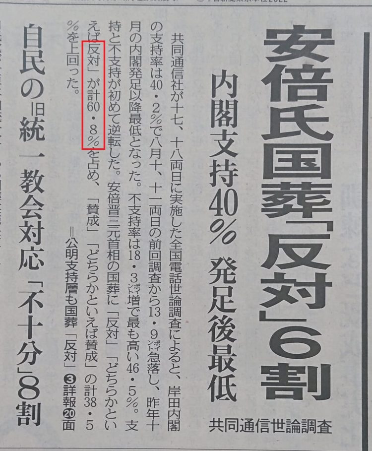 国政は「【国葬】の日が近付けば国民はあきらめる」と思っていたのか❓❓ 野党は集団的自衛権など、これまで結果を残せずに来た。今回そこで市民団体や、それに賛同する国民が立ち上がりました。 各大使館にも(日本国民の多くが望んでいないので)国葬不参加の要請活動を行いました。過去、野党はそのような事までやったでしょうか。与党だけでなく、国政を変える必要があります。 (記事は、今朝の東京新聞1面トップ。🌀台風の日に新聞をお読み下さいませ。)