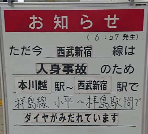 (📷8時半現在も西武新宿線は大幅に遅れてます。中央線も人身事故で全線運転見合せていましたが遅延中。職場に向かう市民の方と自殺対策についてお話しました)