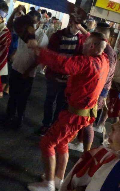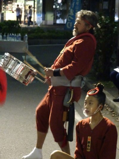 高円寺から阿波踊りに参加の『えんじ(炎士)』さんが、踊る前にアドバイス。