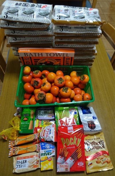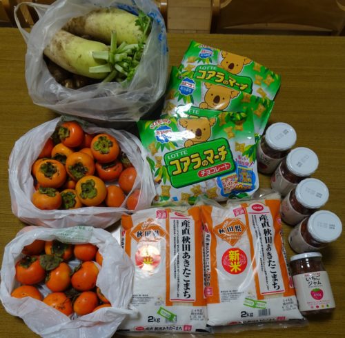7日に頂いた柿や大根・里芋と、その日までにお預かりしたジャム・お菓子・お米。
