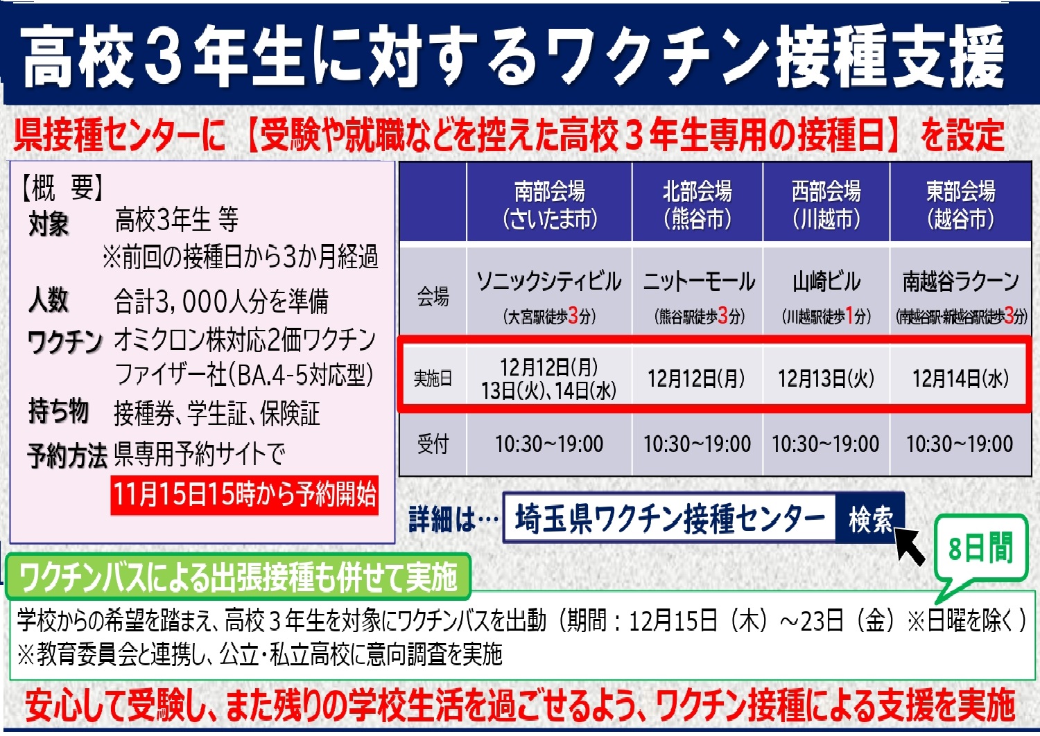 【県ワクチン接種センター】高校3年生対象のワクチン接種についてー埼玉県