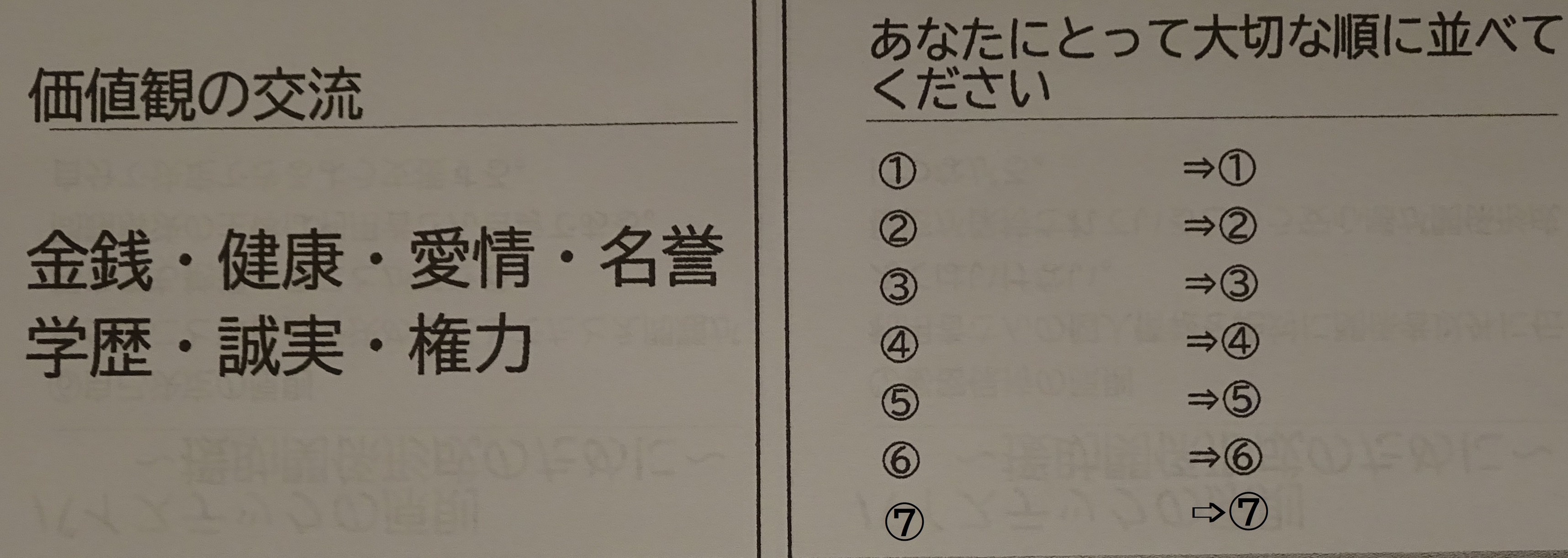 大切だと思う順に並べる時、言葉を少し言い換えてもいいと思いました。例えば学歴=学力・知識。権力=人権。