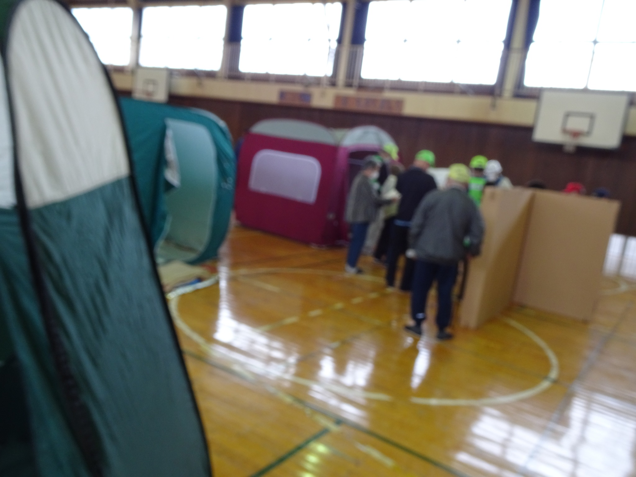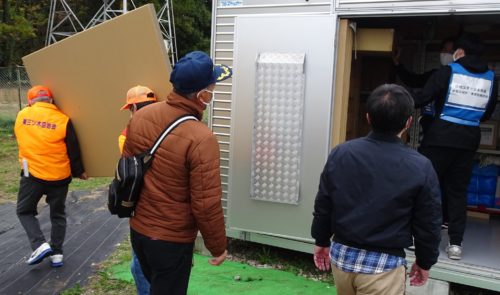 📷防災倉庫から参加者が防災用具を避難所に運んでいるところ
