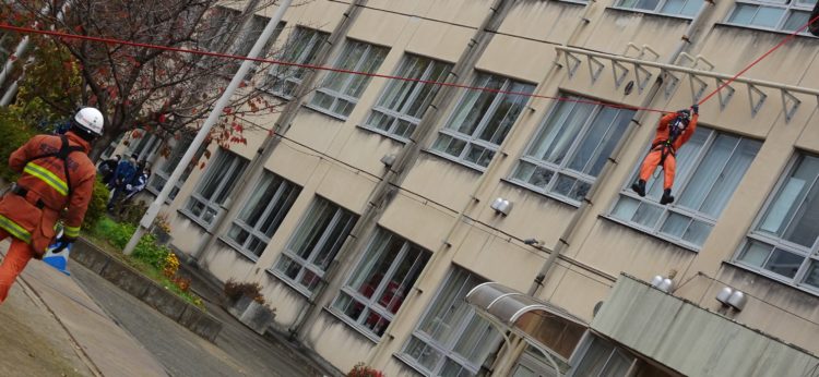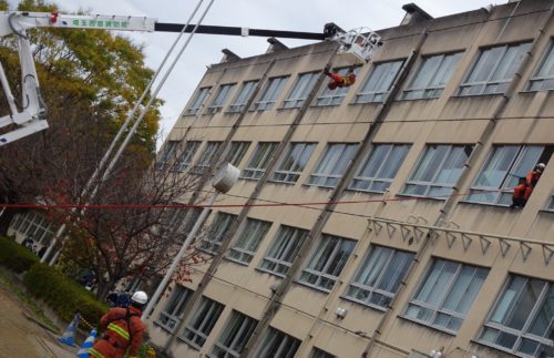 (📷4階から、はしご車で救出訓練)