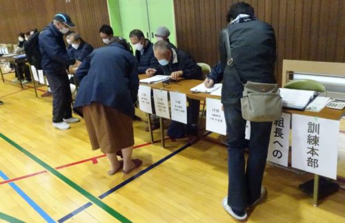 自治会の班長さんが、各世帯を回り『安否確認訓練』を行った結果を報告しに避難所に来ているところ。