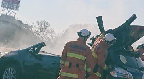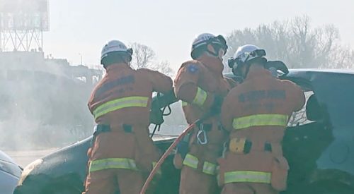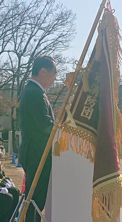 狭山での銃撃事件について式典の合間に知事や自治会長さん達と話しました。出初式で中学校の吹奏楽の演奏が予定されていたのですが、当該地区の事件だった為、急きょ中止になり、残念です。『消防訓練』では📷写真のように車のボディを重機で切断し、救出訓練が行われました。