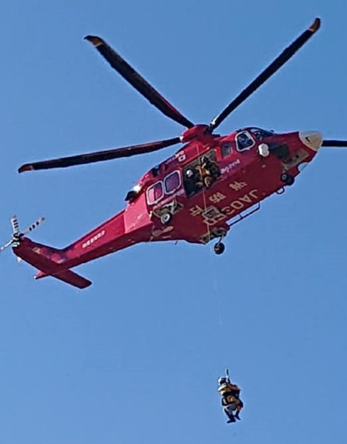 隊員が救出訓練の為、1度ロープで下り、写真のように救助。