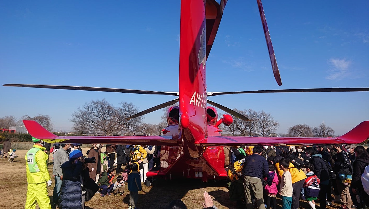 県防災ヘリも飛来。訓練の後、上奥富運動公園に下りて、お子さん連れの記念撮影に隊員さん達が応じていました。