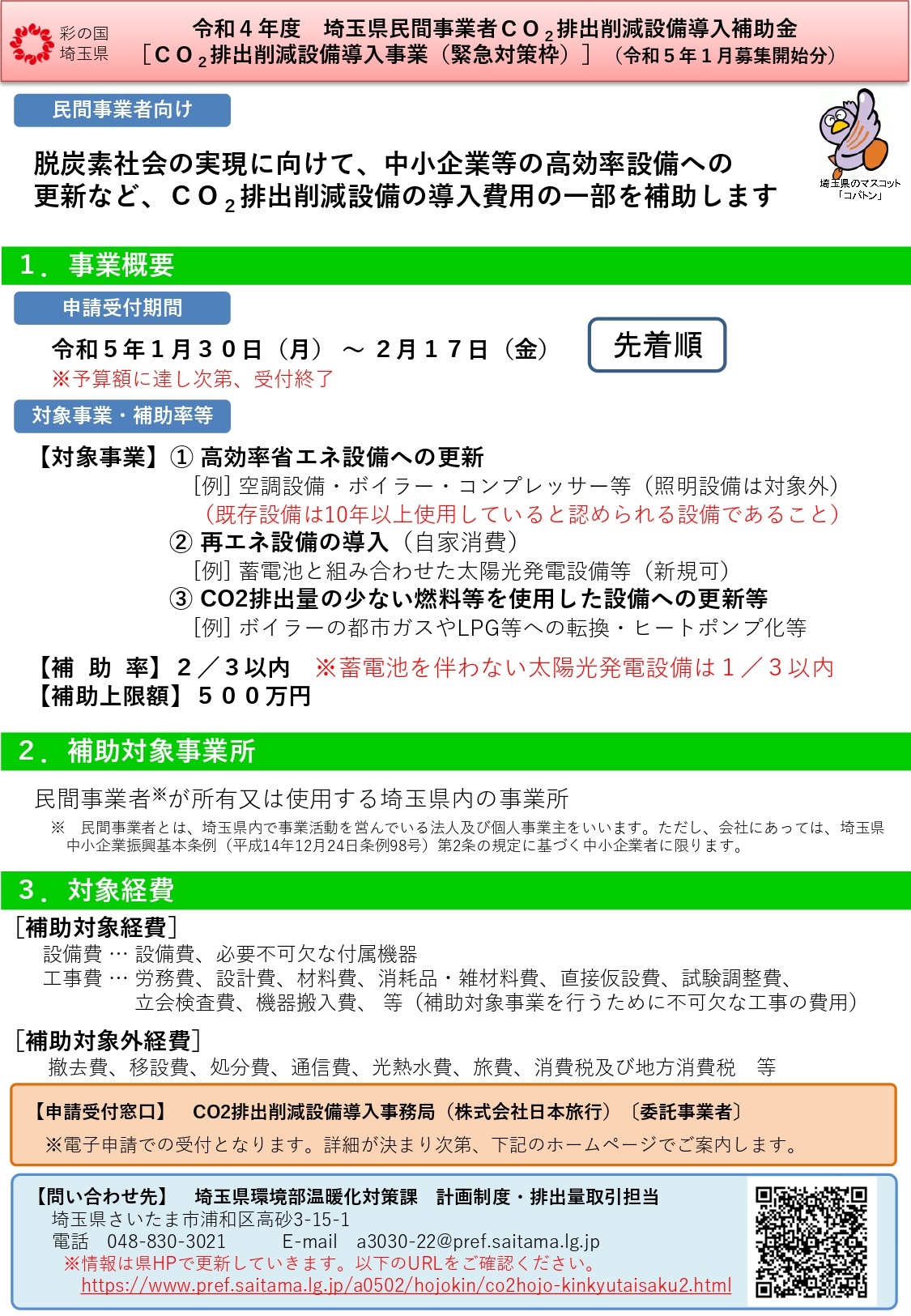 令和4年度 CO2排出削減設備導入事業【緊急対策枠】(令和5年1月募集開始分)-埼玉県