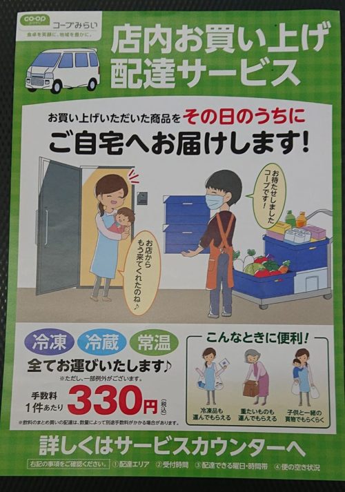 『配達サービス』チラシ。利用の際は、買い物する前にサービスカウンターにお声がけ下さいとの事です。