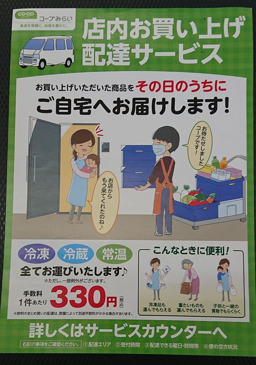 お店で会計後【配達】も出来ると確認しました(お店からおよそ3kmまで。1回税込330円。狭山台店の他、県内どこのお店が配達対象か、コメント欄に掲載しました。