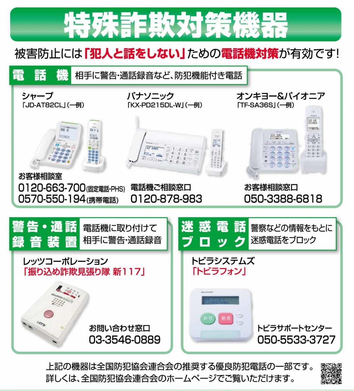 電気店さんは修理・納品などで住宅に入ってお話しするので、市役所には「電気店さんに、詐欺対策の電話機の推奨について少しでもお話して頂けるようお願い」をする打合せをしています(街の電気屋さんに私から直接話し始めてもいます)。