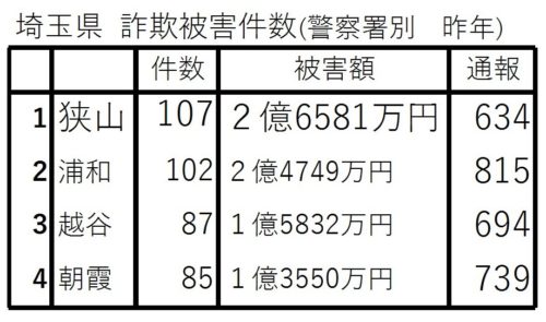 【詐欺被害】狭山警察署管内 県内ワースト 過去4年で3年間